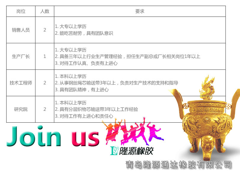 青島隆源通達橡膠有限公司是專(zhuān)業(yè)生產(chǎn)輸送帶的公司,根據公司業(yè)務(wù)需要,現招收以下人員:
